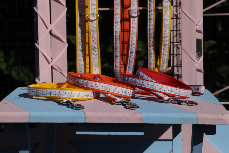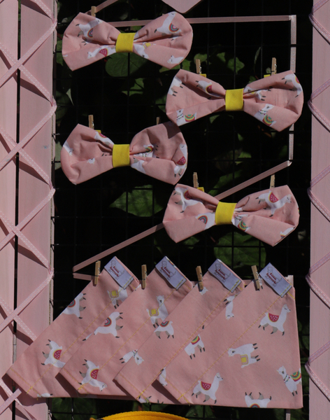 Our alpaca accessory set includes a lead, collar and either a cotton bandanna or bow tie.The lead and collar are made from cushion webbing in a choice of 3 colours and coupled with a gorgeous alpaca ribbon. The small set comes in 19mm wide webbing. The collar fits 27-37cm approx and fastens securely with a metal buckle and D ring catcher.