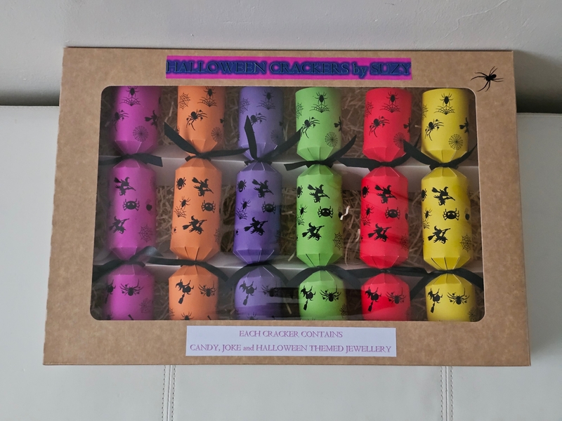 Delivery & Returns PolicyA box of 6 spider shaped crackers each containing a joke, a treat and a piece of hand made Halloween themed jewellery.