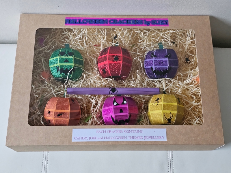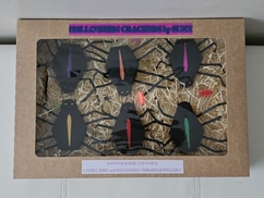 Delivery & Returns PolicyA box of 6 spider shaped crackers each containing a joke, a treat and a piece of hand made Halloween themed jewellery.