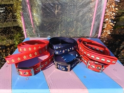 Our Christmas accessory range is made from cushion webbing in a choice of 5 colours with 11 beautiful Christmas ribbons to choose from. Patterns listed as the leads in the main image.The extra small set comes in 19mm wide webbing. The collar fits 23 - 29 cm approx and fastens securely with a metal buckle and D ring catcher.