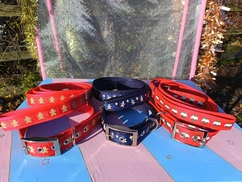 Our Christmas accessory range is made from cushion webbing in a choice of 5 colours with 11 beautiful Christmas ribbons to choose from. Patterns listed as the leads in the main image.The large set comes in 24mm wide webbing. The collar fits 43 -53 cm approx and fastens securely with a metal buckle and D ring catcher.