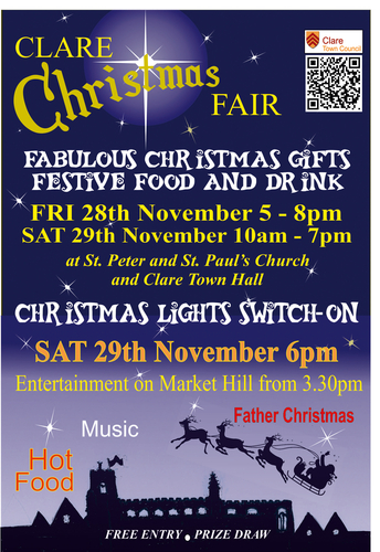 The Clare Christmas Fair is a popular and well-attended festive event held over two days in the centre of the lovely market town of Clare, Suffolk. Held on Friday evening and all day Saturday and with around seventy exhibitors it provides a great opportunity to do all your Christmas shopping in one place - plus there is lots of entertainment for families including Father Christmas, Face Painting and the Christmas Lights Switch-On which takes place on the Saturday with street entertainment and live music including from The Spark, a rock/pop/indie cover band. **Please note that the fair is now fully booked but spaces may become available due to cancellations - so please get in touch and I will send you more information and let you know asap.www.clarechristmasfair.comCar Parking Information