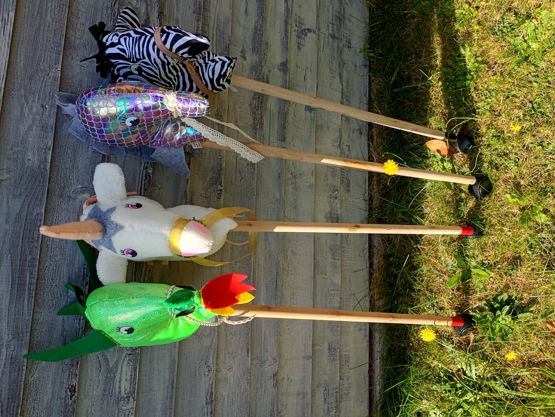 Hand made 'animal hobby horses' sea horse, zebra , dragon , unicorn, reindeer (I can make to order) I use a strong wooden pole , each horse has a wheel on base, the heads are made from a variety of materials. Delivery & Returns Policy