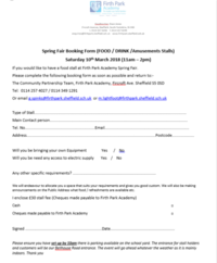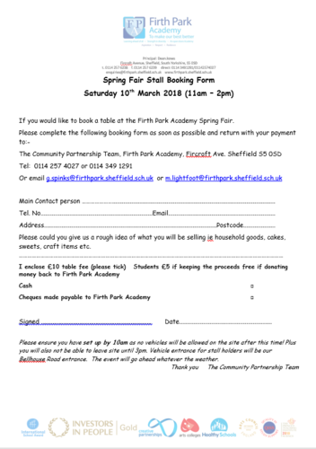 Spring fair at Firth Park Academy in Shiregreen, Sheffield. Entrance is via the Bellhouse Road gates for stall holders and customers. The price of a stall is £10 but for a food stall it is £30. We will have entertainment, BBQ, refreshments, raffle, tombola, bouncy castles, plus much more.Car Parking Information