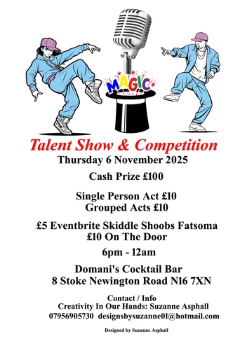 A talent show & competition. The experience, of showing the talent within you. Taking place at Domani's Cocktail Bar ,London N16 7XN.