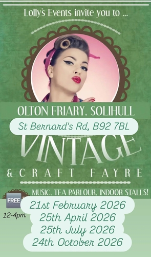 You are invited to ... Lolly's Events - 2026 Vintage & Craft Fairs at the lovely Olton Friary, Solihull!