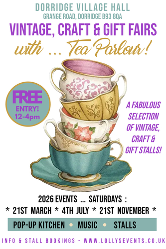 ** We are looking for a wide range of stalls to feature at these fun community events! Please EMAIL or message us on Facebook with details of the products you sell so that we can check availability. Stalls are booked via our website **You are invited to Lolly's Events 2026 Vintage, Craft & Gift Fairs at the lovely Dorridge Village Hall!